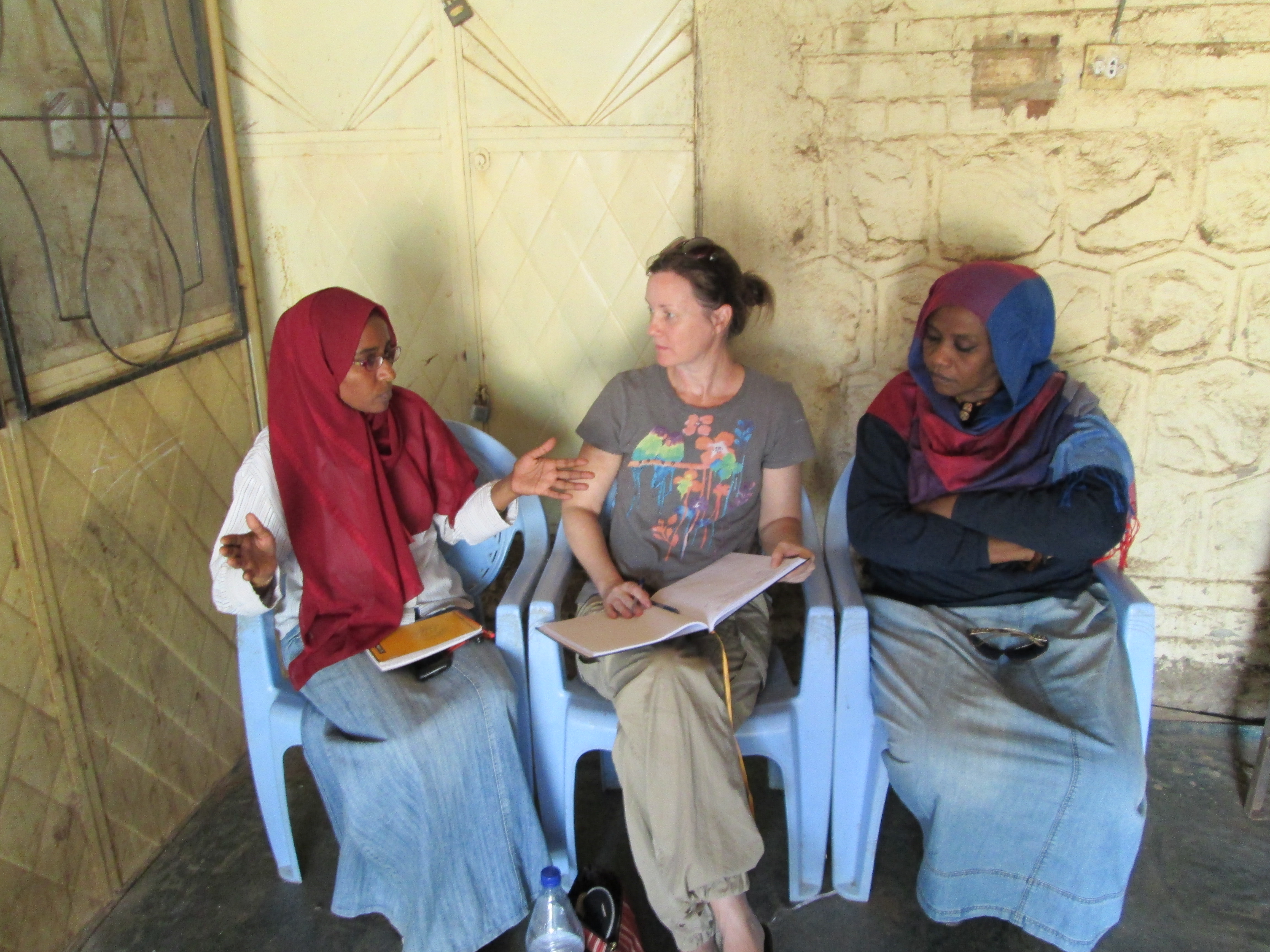 Zeinab Abdalla (left), Project Officer with The Carter Center in Sudan, discusses the logistics involved in conducting a mass drug administration (MDA) with Birgit Bolton (middle), ITI Senior Program Associate, prior to going into the field with Dr. Balgesa Elkheir Elshafie (right), an ophthalmologist and National Coordinator of Sudan Trachoma Control Program, Federal Ministry of Health. The women are in Doka village. Photo courtesy of Ahmed, Doka Health Officer.