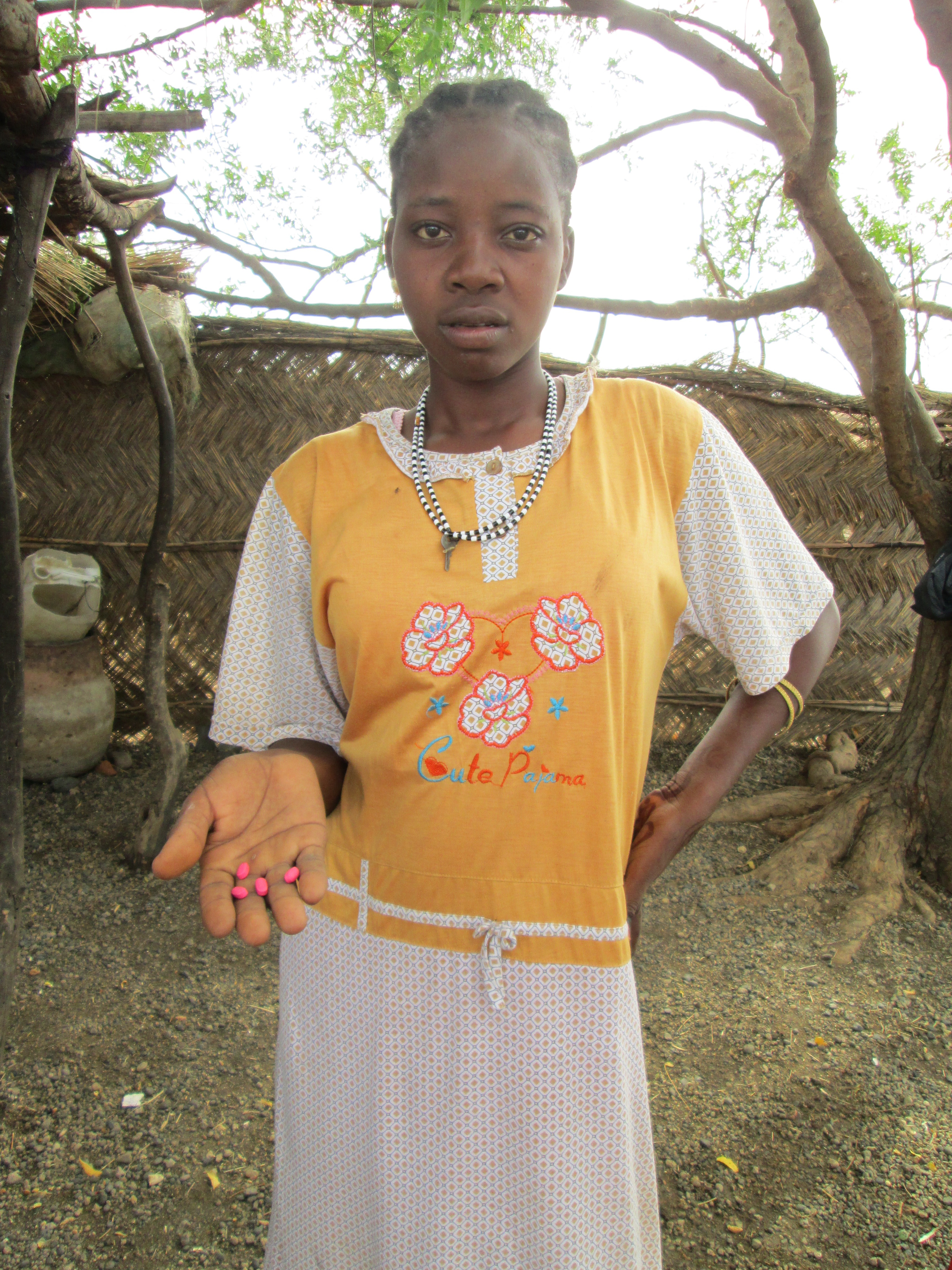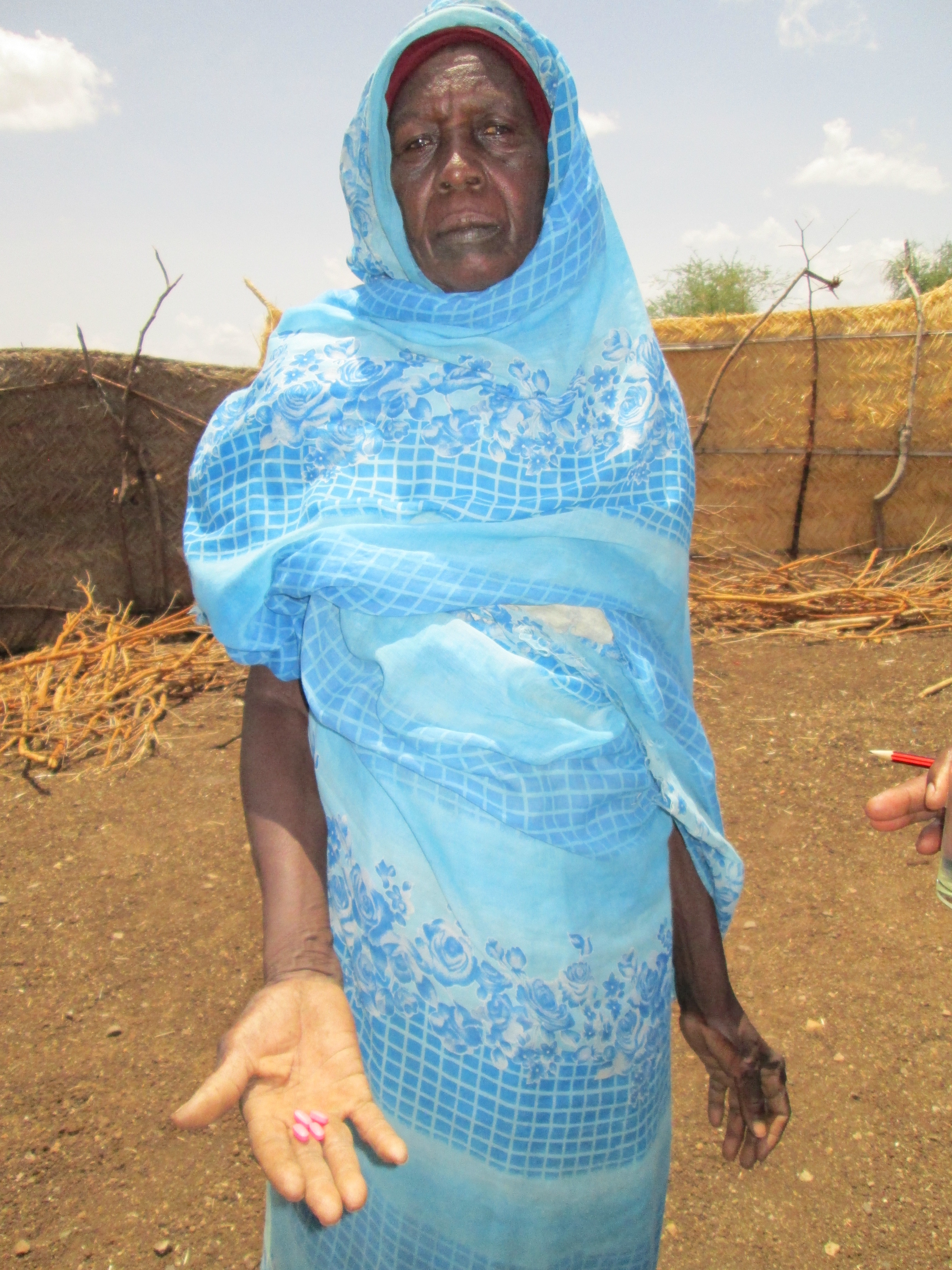 A woman from a village in Al Qadarif State receives a dose of four Zithromax® tablets during the June 2013 MDA. Doses are calculated carefully by height using a dosing stick. Some of the sub-districts of Al Qadarif State have documented TF as high of 34% which requires a 5 year MDA treatment cycle. Photo by Birgit Bolton for ITI.