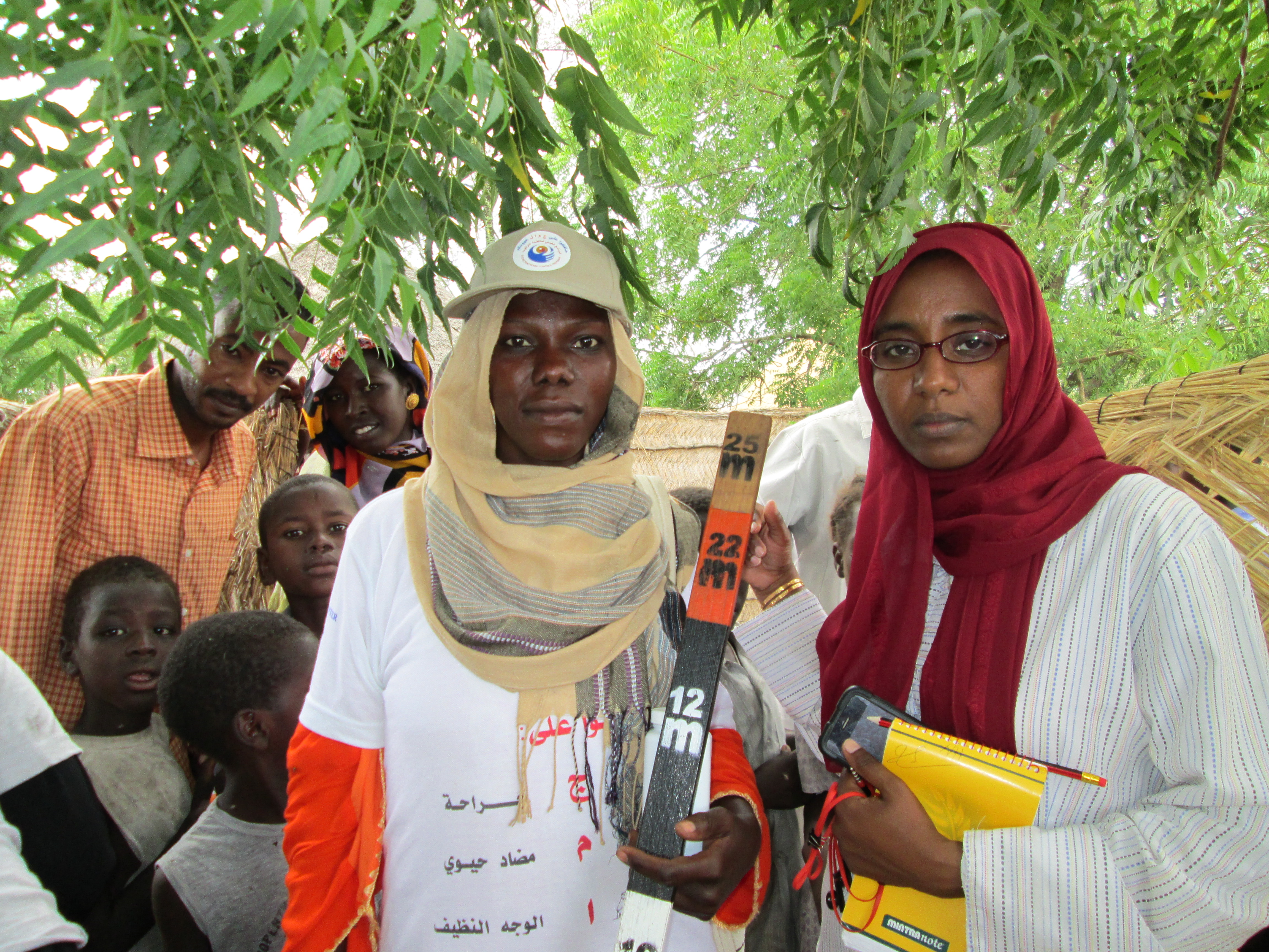 A MDA public health village volunteer (left), with Zeinab Abdalla (right), Project Officer for The Carter Center/MDA Supervisor, holds a dosing stick used to calculate accurate doses of Zithromax® during a MDA in Doka in El Doka village. Photo by Birgit Bolton for ITI.