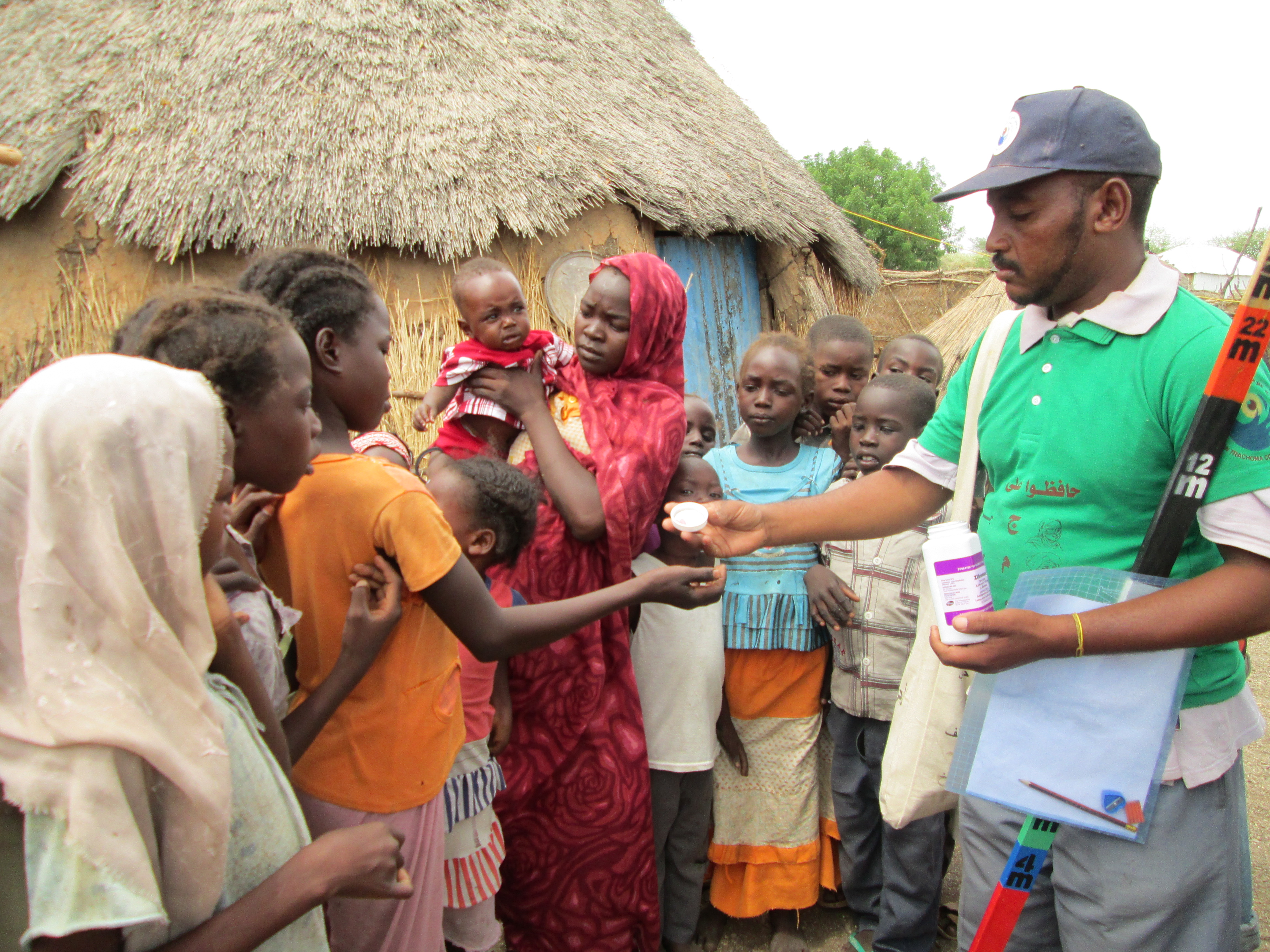 El Tahir, a MDA public health volunteer, is shown here with his dosing stick and Zithromax® distributing carefully measured doses of Zithromax® to community members during the June 2013 MDA in El Saraf village. Teams of public health volunteers conduct MDAs by visiting each household throughout an entire village. Some villages have populations as large as 17,000 people. Photo by Birgit Bolton for ITI.