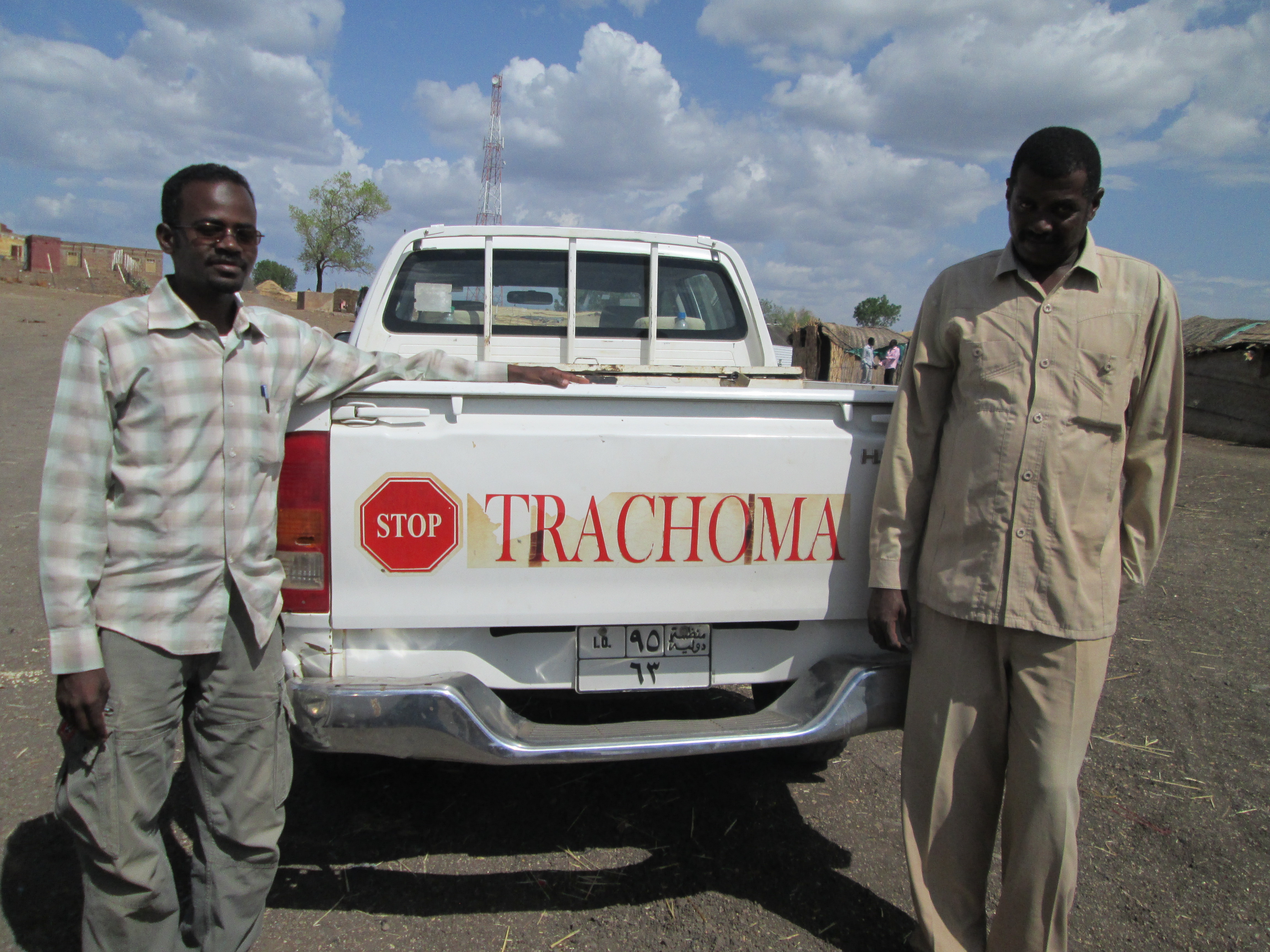 Atif Al Ameen Ahmed, Public Health Officer for the National Trachoma Control Program/MDA Supervisor and Majdi Mohamed, driver for the National Trachoma Control Program/Federal Ministry of Health, stand by the Stop Trachoma truck used to transport Zithromax® to villages that participated in the MDA in the Mahala sub-district, East El Galabatof Sudan. Photo by Birgit Bolton for ITI.