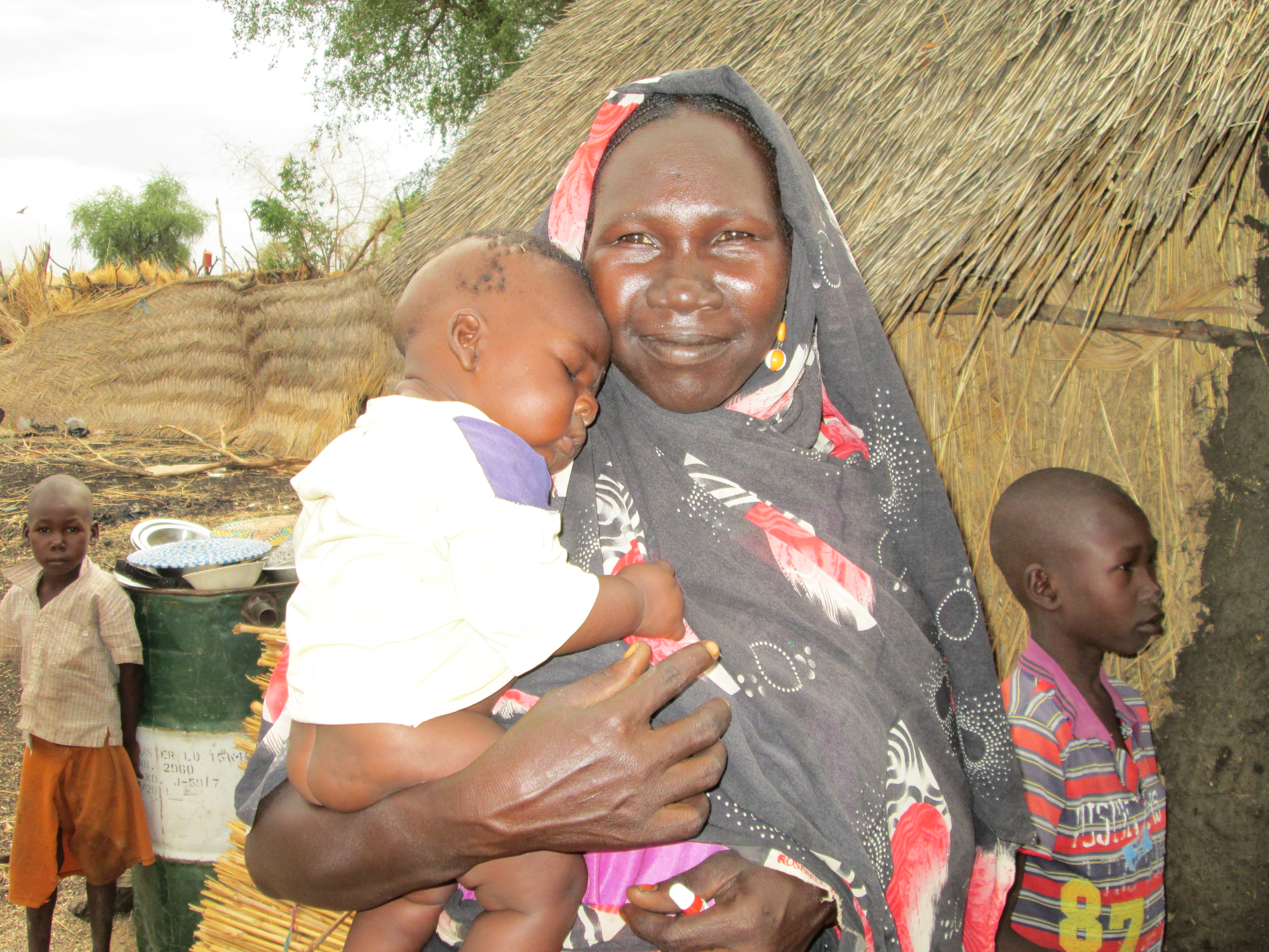 A Sudanese mother proudly shows off her infant in Doka village. During this MDA the mother was treated with Zithromax® and her child received a tube of Tetracycline Eye Ointment (TEO) seen in the mother's left hand. TEO is given to infants under 6 months of age since they are too young to swallow Pediatric Oral Suspension or tablets. Photo by Birgit Bolton for ITI.